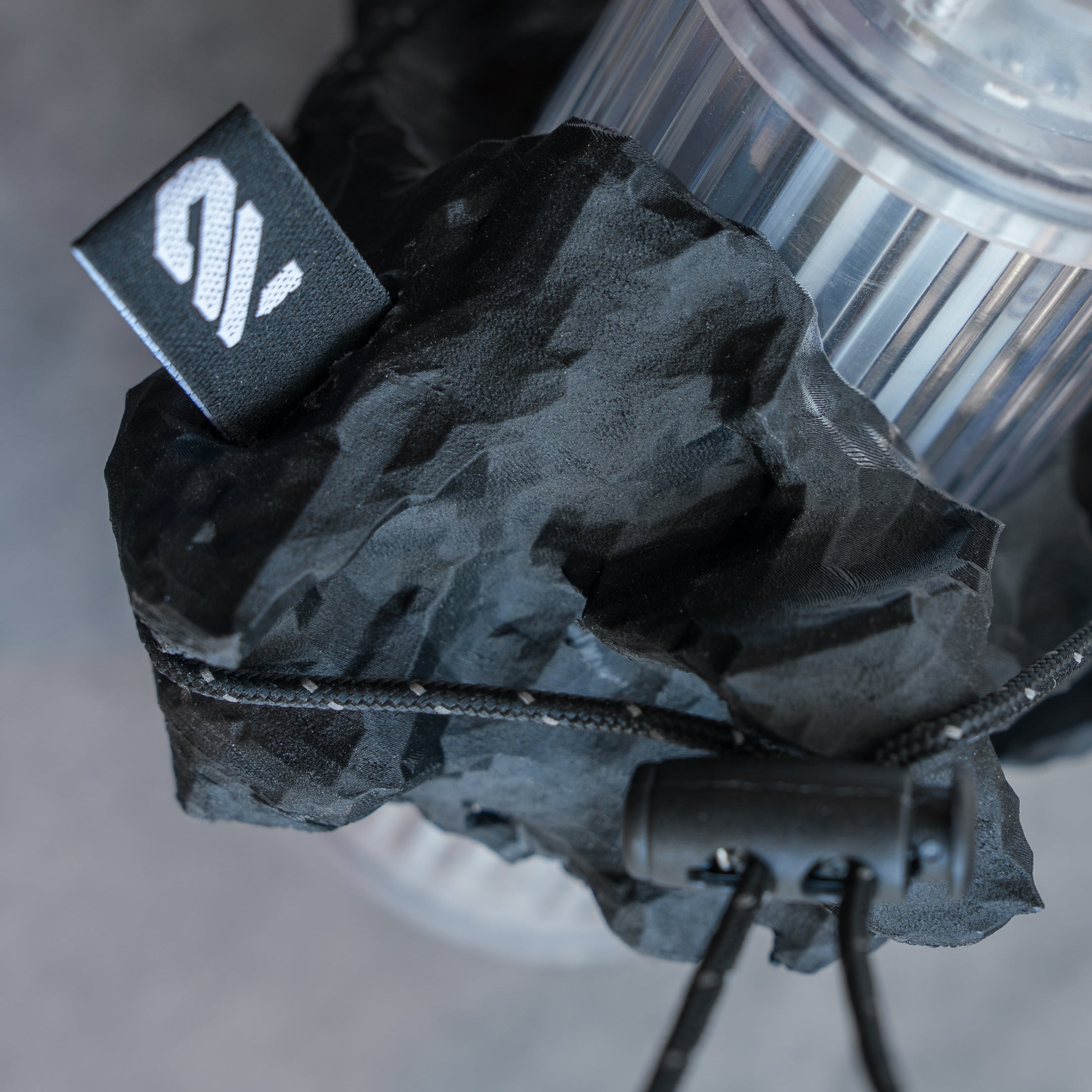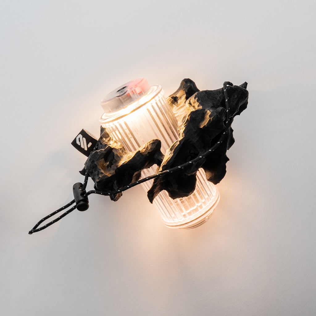 本体には1/4カメラネジ対応のマウントを搭載。三脚やカメラアクセサリーとの組み合わせはもちろん、{node}に巻かれたガイロープを使って吊るすことも可能です。卓上でもハンギングでも、シーンに合わせて自在に灯りを楽しめます。