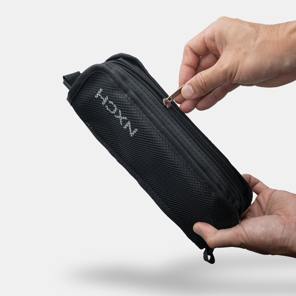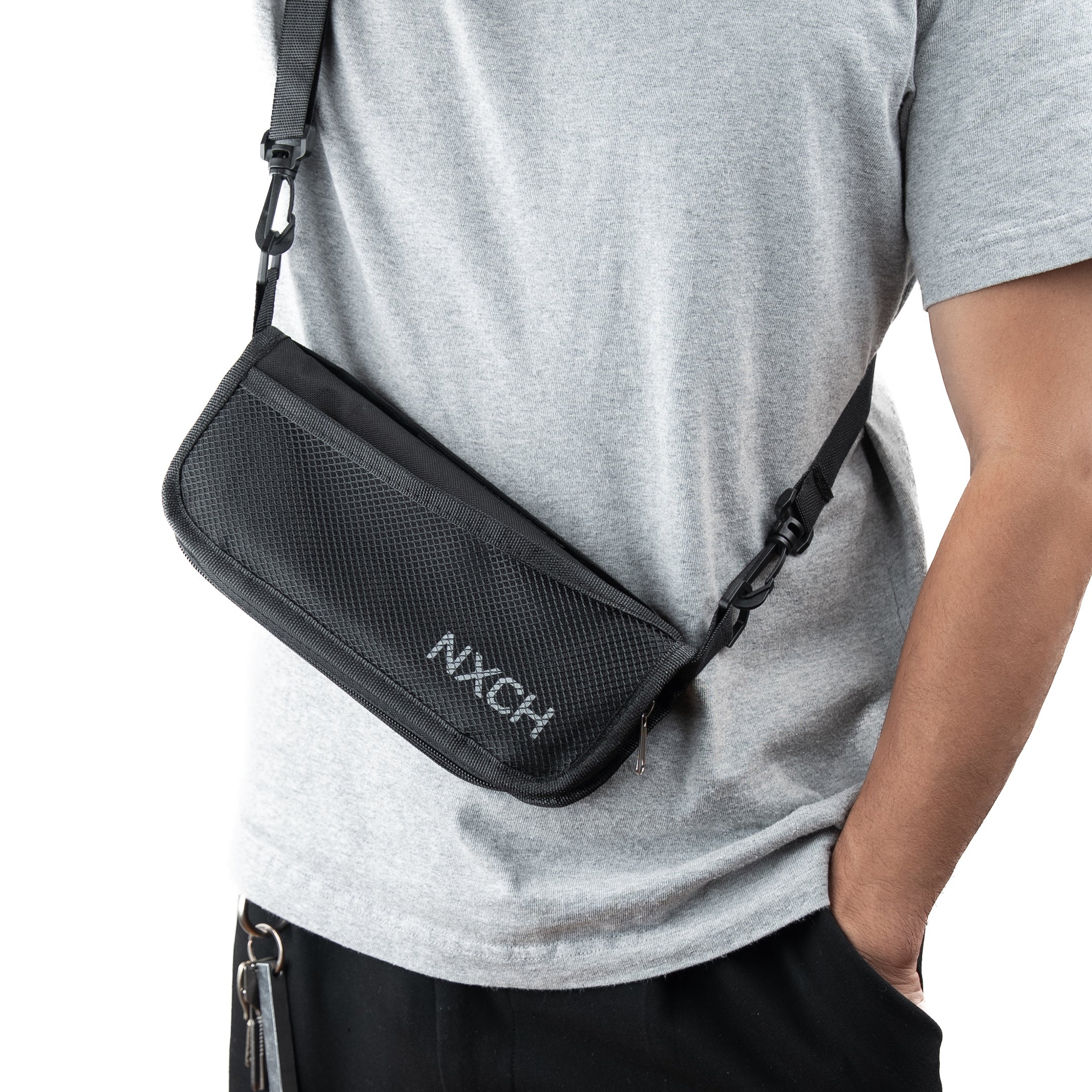 ショルダーストラップは標準装備。 斜め掛けでの持ち運びが可能なうえ、メッシュ仕様の収納部分にはスマートフォンや鍵などをそのまま収納可能。 軽量バッグとしての実用性も備えています。
