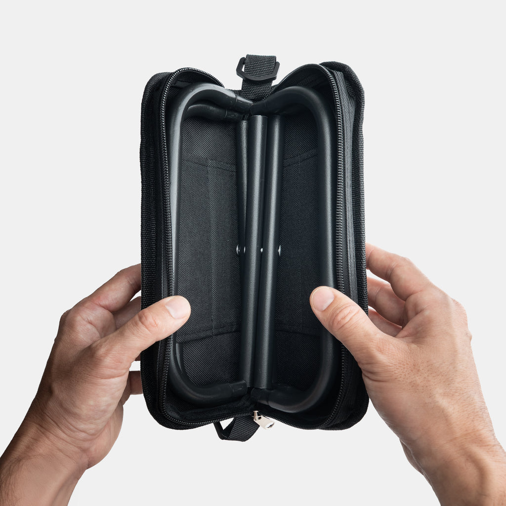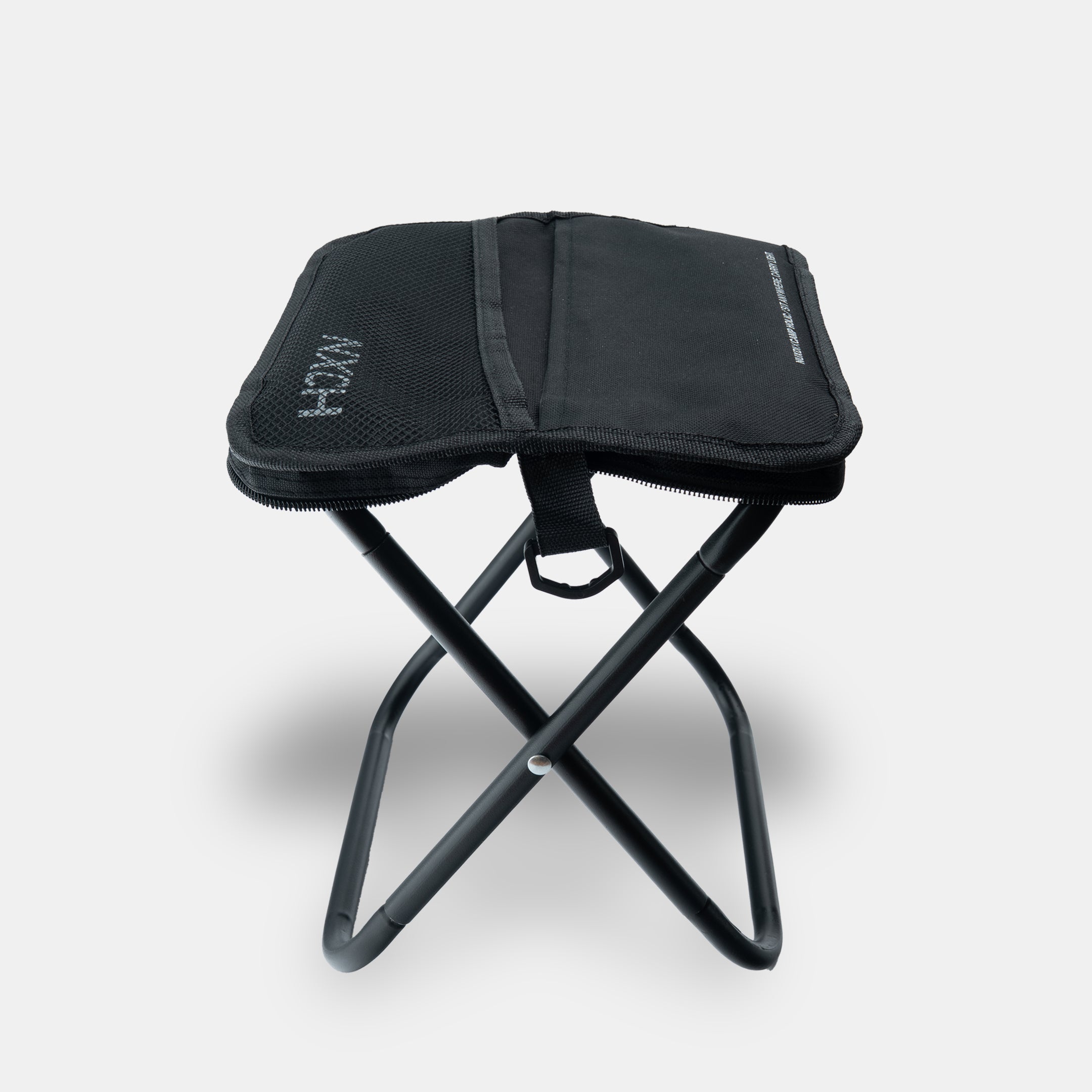 収納袋から引き出し、開くだけで設置は完了。 使い終わったあとは、そのまま座面裏にフレームを折りたたむだけの一体型設計。 収納袋を別に持ち歩く必要もなく、余計なストレスがありません。
